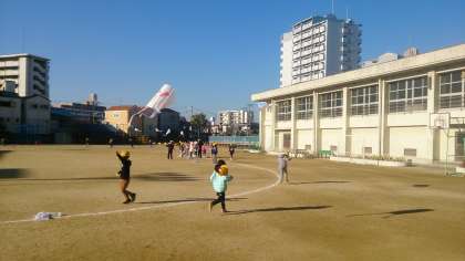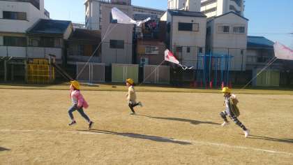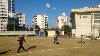 凧作りと凧あげをしました。自分でデザインした凧が青空に舞い上がって、子どもたちはとても楽しそうでした。