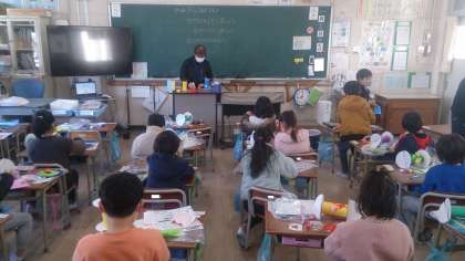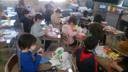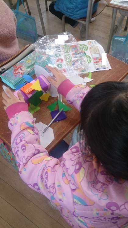 教材「かみざらコロコロ」の作品づくりに取り組みました。紙皿を利用して転がして遊ぶおもちゃ作りです。