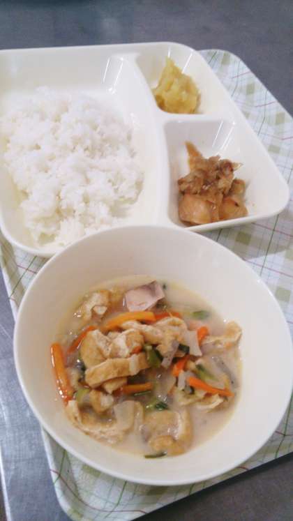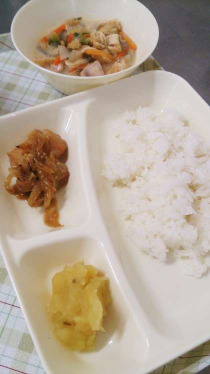 今日の給食は、鶏肉の甘辛焼き、かす汁、くりきんとん、ごはん、牛乳です。