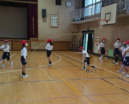 講堂で長縄をしました。みんなリズムよく通り抜けていました。