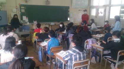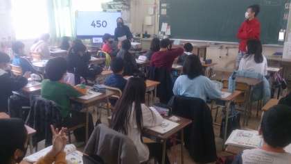 英語で、ものの値段をたずね合う学習をしました。最初に、百以上の数字を英語で話す活動をしています。