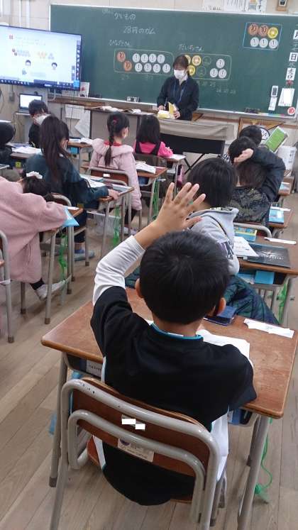 身近な買い物の課題について学習しました。。「28円のガムを買うときにどのようにお金を出しますか?」という課題に対して、1年玉、5円玉、10円玉の模型を使ってお金の出し方を考えました。