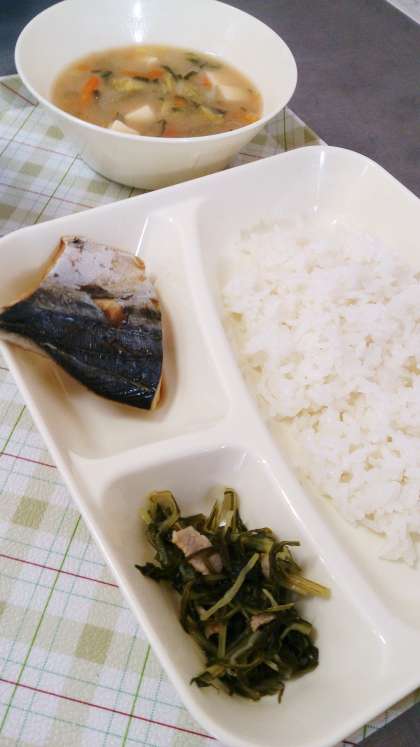 今日の給食は、さごしのしょうゆだれかけ、みそ汁、みずなの煮びたし、ごはん、牛乳です。