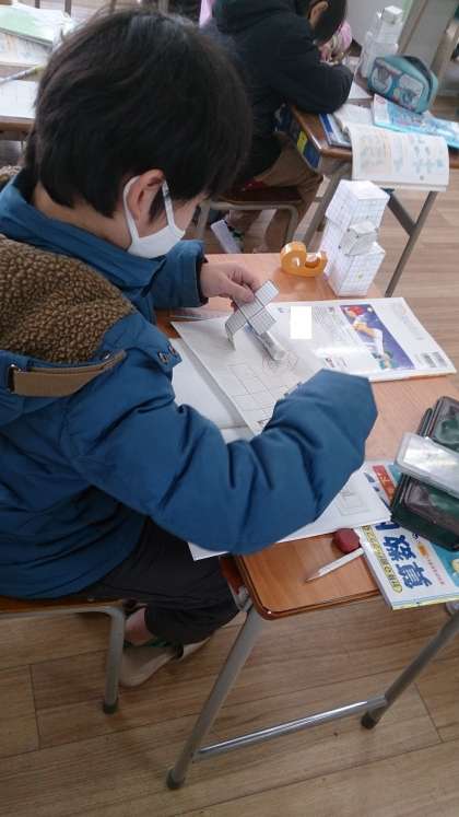 直方体の面と面の関係を調べました。展開図を使いながら学習しています。