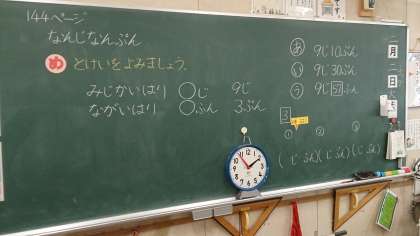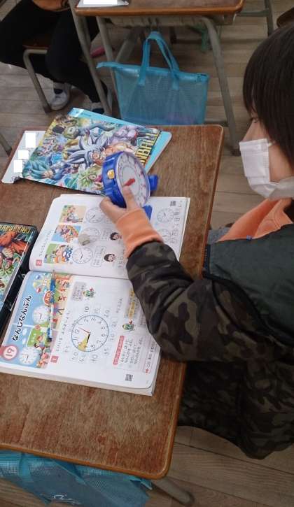 時計の学習をしました。教具の時計を使って、みじかいはりとながいはりを動かして時計の見方を学んでいます。