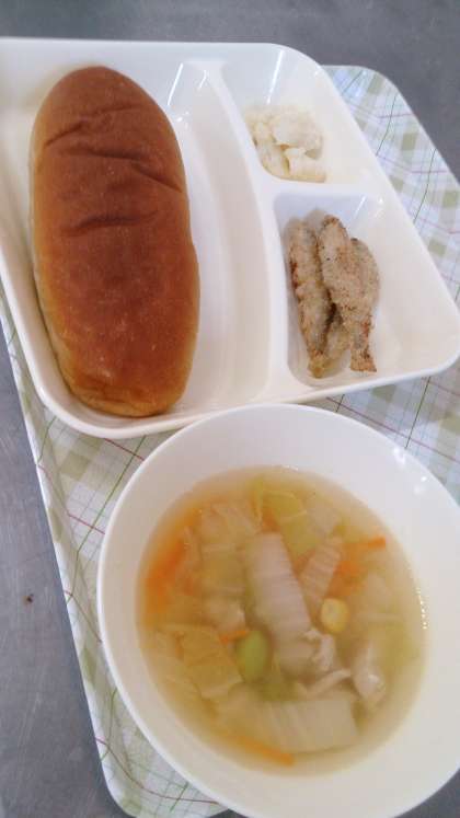 今日の給食は、わかさぎフライ、はくさいのスープ、カリフラワーのサラダ、パン、牛乳です。