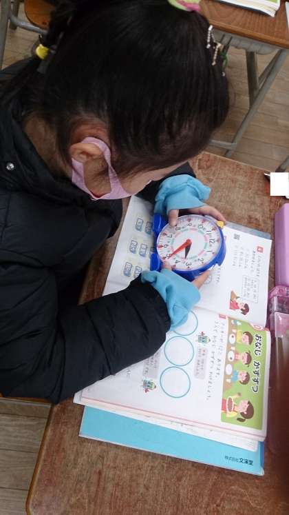 時計の学習をしています。この時間は、「3時24分」「8時35分」などの時刻に、教具の時計のはりを合わせて、時計のよみを学んでいます。、