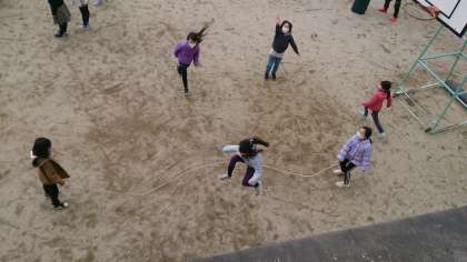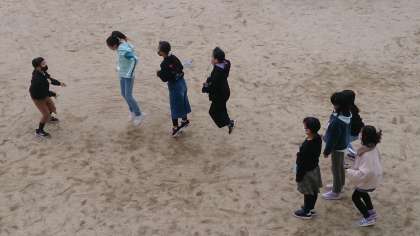 昼休みになわとびをする子どもたちが増えてきました。友だちと楽しそうに長なわで遊んでいます。