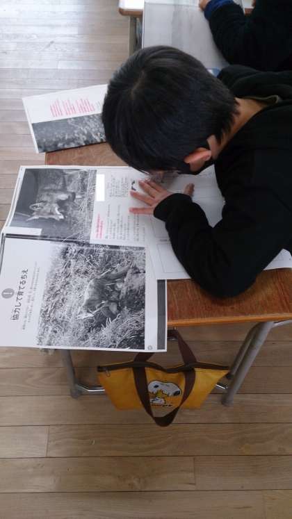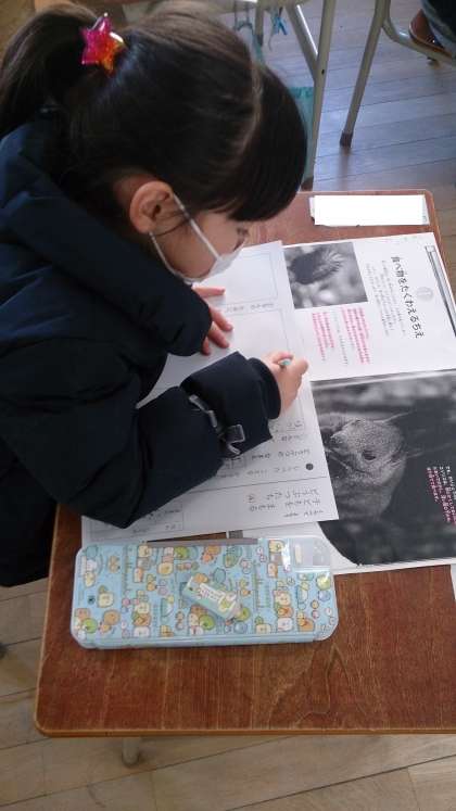 「ほかのどうぶつのちえを調べよう」という学習に取り組みました。どんな動物か、住んでいる場所や体の特徴、どんな知恵を使うかなどを調べて、ワークシートに書いています。