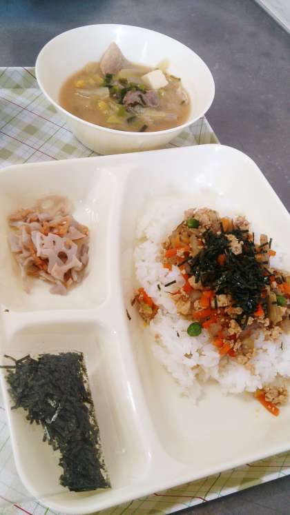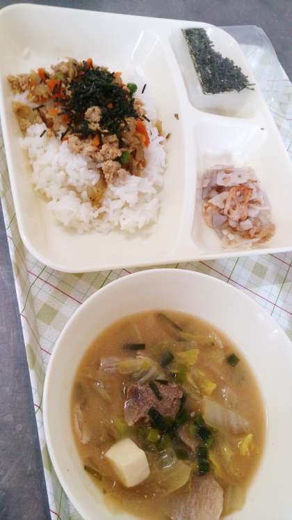 今日の給食は、鶏ごぼうご飯、みそ汁、焼きれんこん、牛乳です。