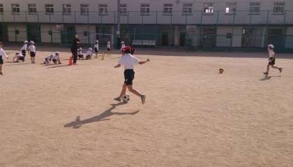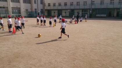 ボールけりゲームをしました。リレー形式で、チームで順番にボールをけっています。ゲーム中、応援の子どもたちは、とても楽しそうでした。