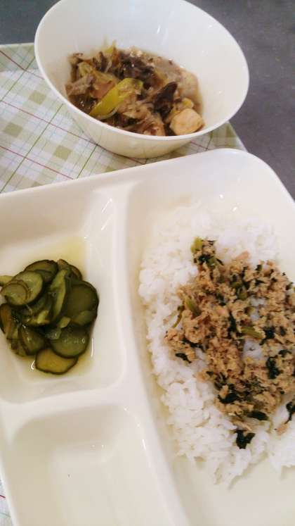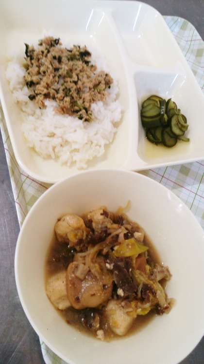 今日の給食は、すき焼き煮(近江牛)、きゅうりのゆずの香あえ、ツナっ葉いため、ごはん、牛乳です。近江牛は、大阪府から提供されました。