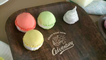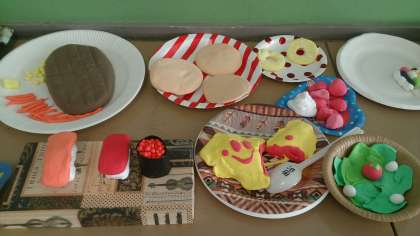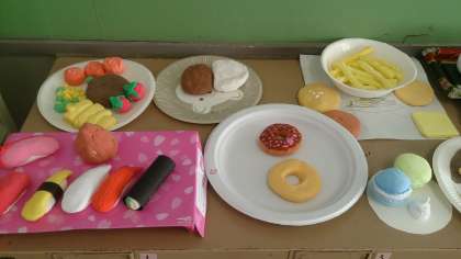 おいしそうな食品が並んでいます。子どもたちが作った「食品サンプル」です。製作中で、これから色付けをしたりニスを塗ったりして仕上げていきます。