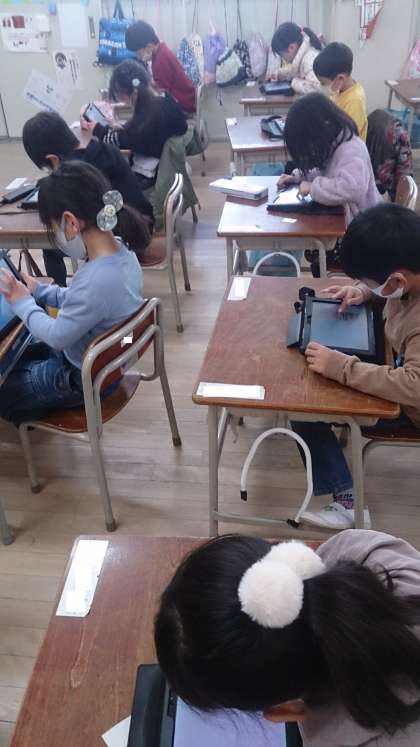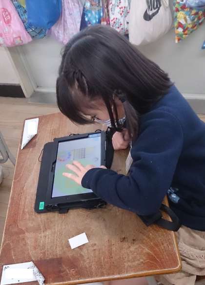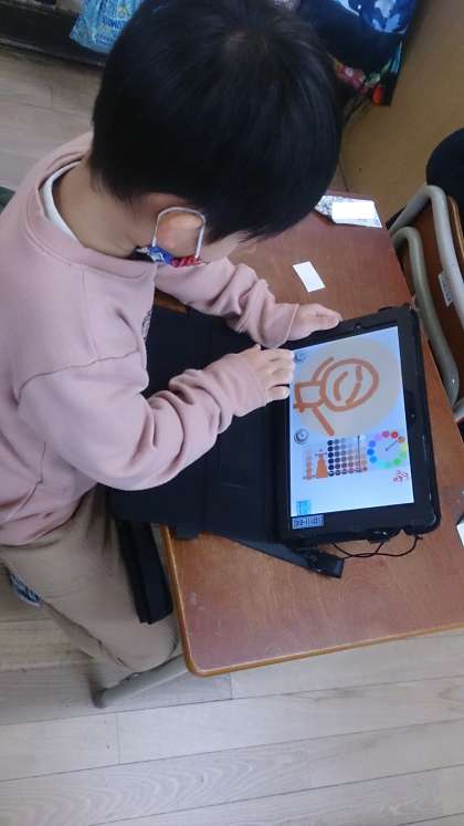 タブレットでお絵かきをしました。「虹」や「動物」など、楽しそうに描いています。