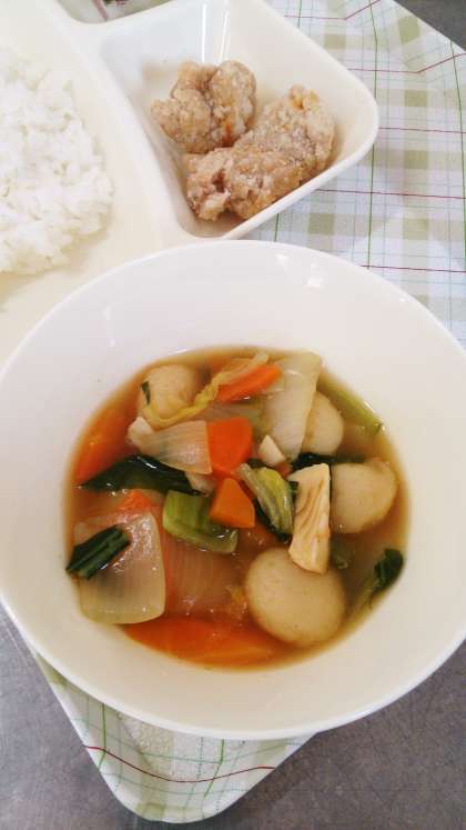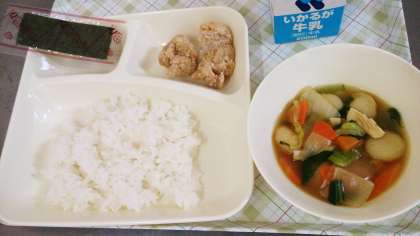 今日の給食は、鶏肉のからあげ、まる天と野菜のうま煮、焼きのり、ごはん、牛乳です。