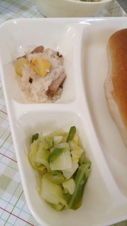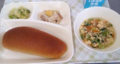 今日の給食は、中華おこわ、卵スープ、キャベツとピーマンのいためもの、パン、牛乳です。