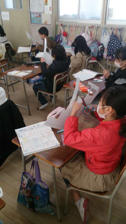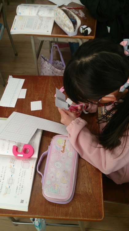 立体図形の特徴をとらえる学習に取り組んでいます。箱作りを通して構成する要素に着目しています。