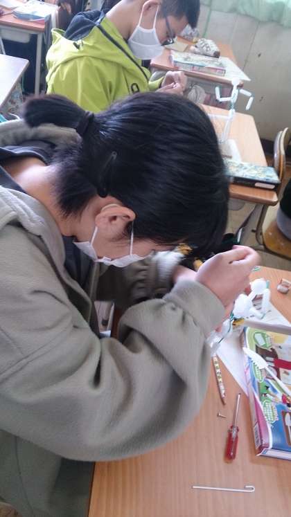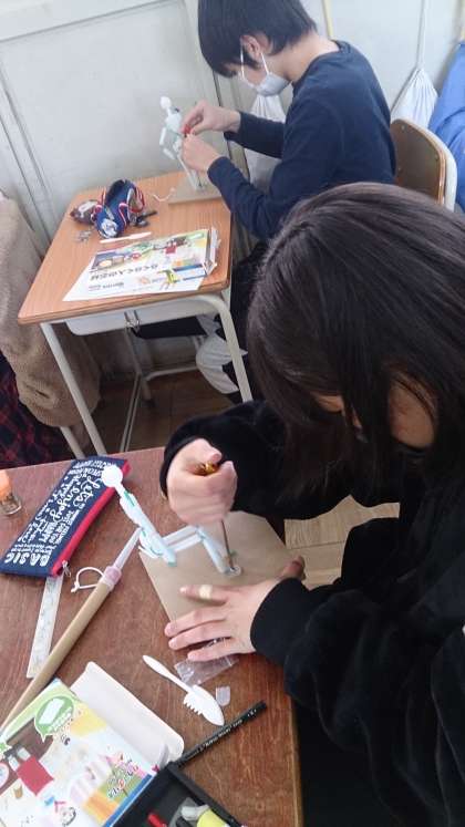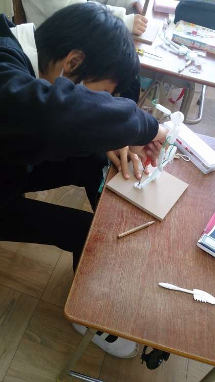 自分の表したい動きを人の芯材を使って表現しています。錐(きり)を使って固定させることにも工夫がいります。みんな真剣です。