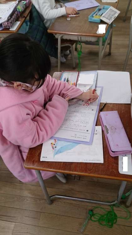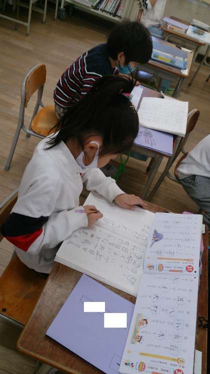 1年生の漢字のまとめをしています。ドリルと漢字ノートに丁寧に書きました。