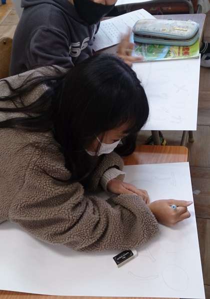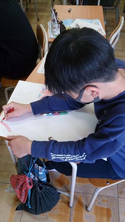 世界の国々を紹介します。画用紙に各国の国旗や特色などの紹介文を書いています。