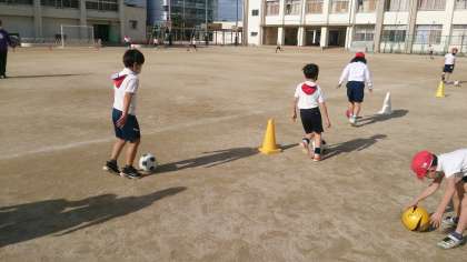 水分補給をしながら子どもたちは、熱心に運動しています。