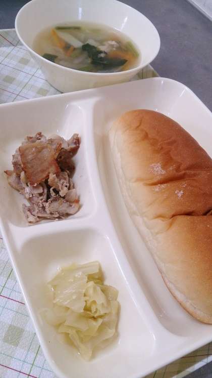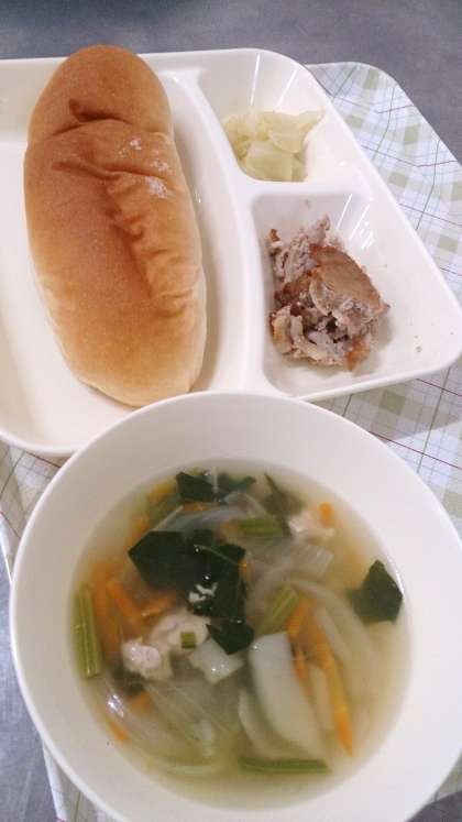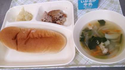 今日の給食は、鶏肉のガーリック焼き、スープ、サワーソテー、パン、牛乳です。