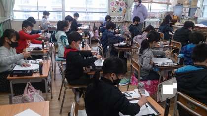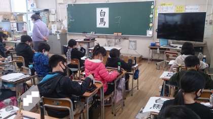 毛筆書写をしました。「白馬」という字を漢字の大きさに気を付けて書いています。