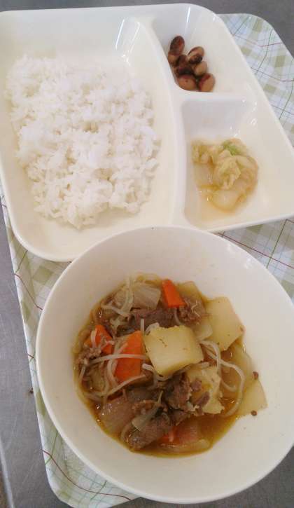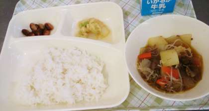 今日の給食は、肉じゃが、はくさいのゆず風味、とら豆の煮もの、ごはん、牛乳です。