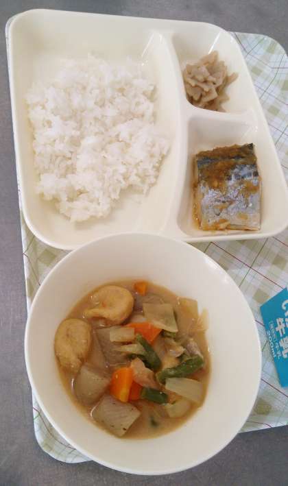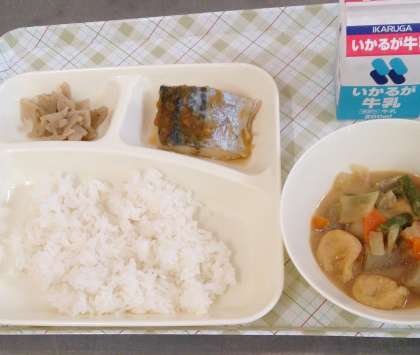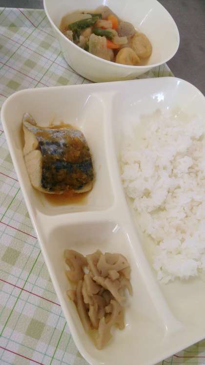 今日の給食は、さごしのおろしじょうゆかけ、一口がんもとさといものみそ煮、れんこんのいためもの、ごはん、牛乳です。