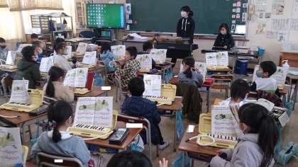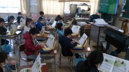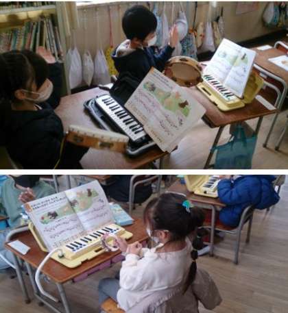 カスタネットやタンバリン、鈴などの楽器で合奏しました。リズミカルに打楽器を演奏しています。