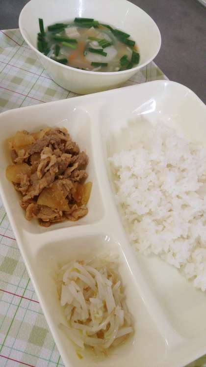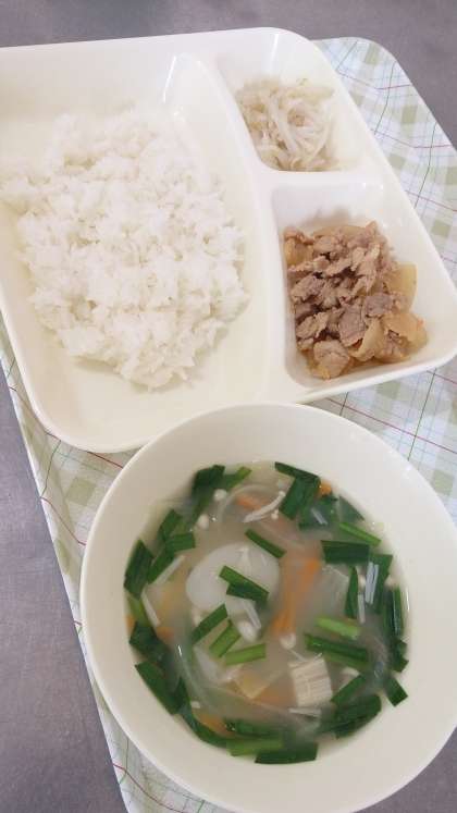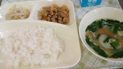 今日の給食は、豚肉のコチジャンいため、トック、もやしのナムル、ごはん、牛乳です。