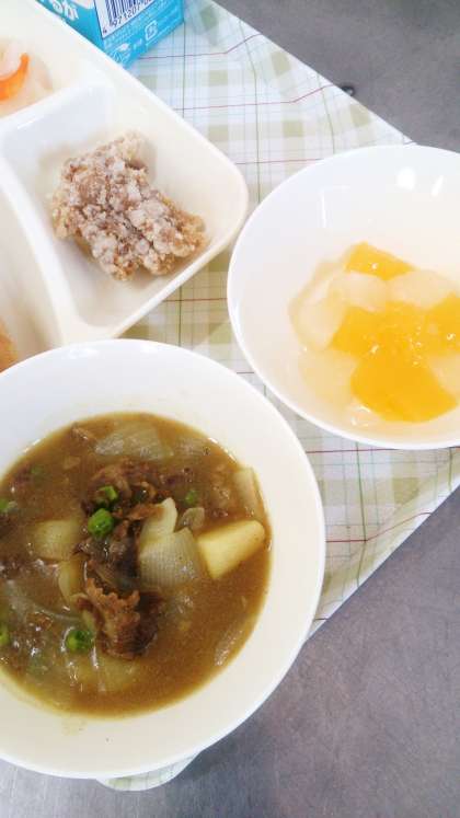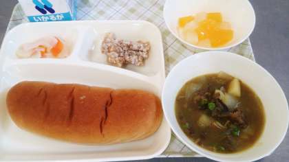 今日の給食は、フライドチキン、カレーシチュー(近江牛)、お祝いピクルス、フルーツゼリー、パン、牛乳の「卒業お祝い献立」」です。