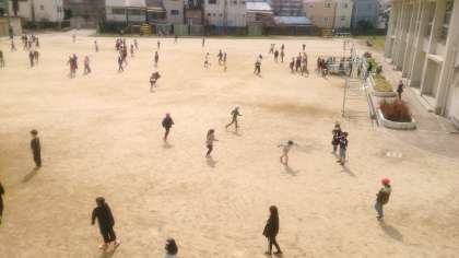 昼休み、気温も上がって、運動場ではたくさんの子どもたちが遊んでいます。