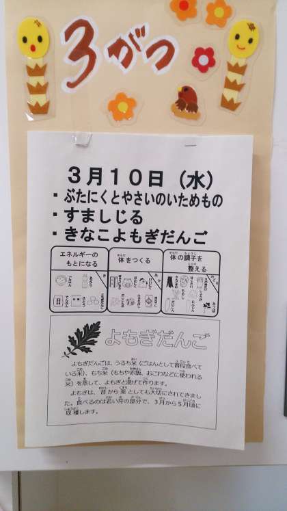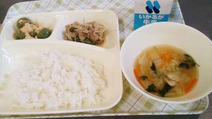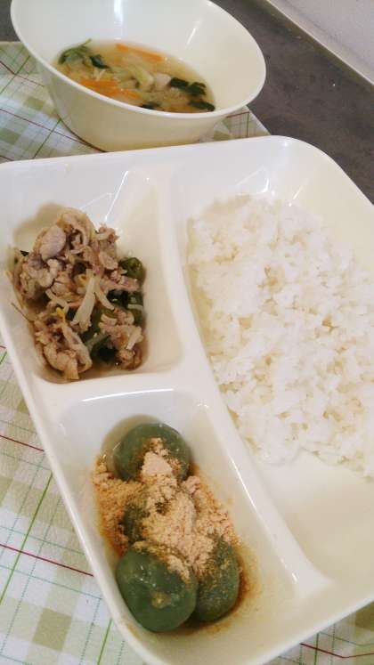 今日の給食は、豚肉と野菜のいためもの、すまし汁、きな粉よもぎだんご、ごはん、牛乳です。