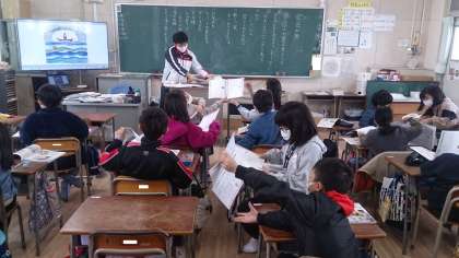教材「金色の魚」の学習をしました。よくばりな心について意見交流しました。ノートを友だちと交換して自分の考えを伝えています。