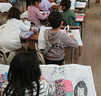 作品袋を作っています。完成したら、1年間で作った作品を入れて持って帰ります。