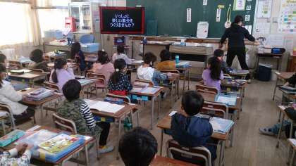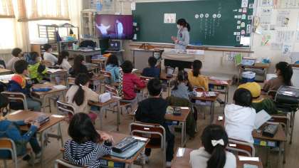 今朝、児童集会がありました。集会委員会のビデオ集会でした。1年間を振り返って委員会活動などが紹介されました。写真は、1年生教室でのビデオ放送を見る子どもたちの様子です。