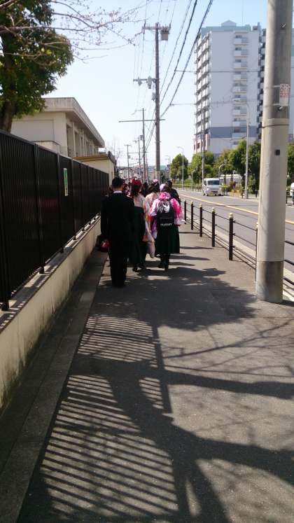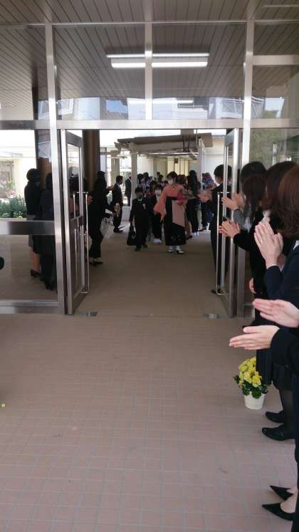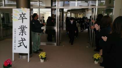 卒業生が保護者の方々や教職員の拍手の中、笑顔で正門から広い大空にはばたいていきました。
