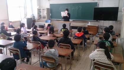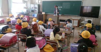 2年生の学級開きです。ランドセルの置き場所を確かめたり先生が自己紹介などをしたりしている様子です。