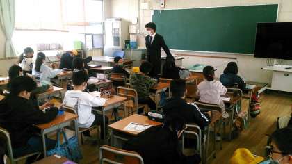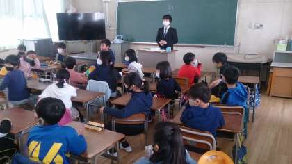 4年生の学級開きの様子です。先生の自己紹介や配布物を配っています。