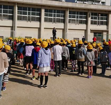 今年度初めての児童朝会が運動場で行われました。どの学年も落ち着いて静かに先生たちの話を聞けていました。