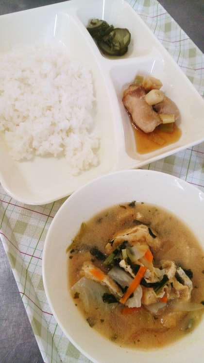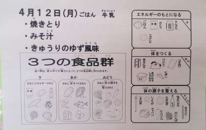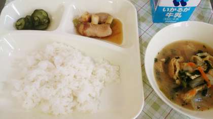 今日の給食は、焼きとり、みそ汁、きゅうりのゆず風味、ごはん、牛乳です。