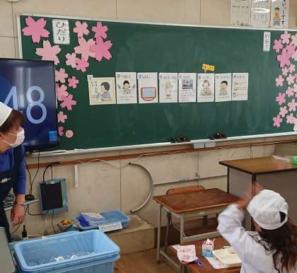 給食の時間はどのように過ごすか、黒板を見ながら確かめて動いています。少しずつ自分たちでできることが増えるように指導していきます。