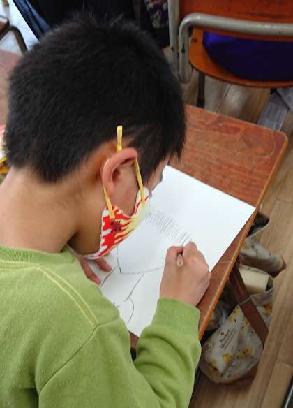自分の似顔絵を描いています。完成したら学級のめあてと共に掲示します。