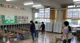 6年生が、1年生の教室を掃除しています。隅々まで丁寧にほうきではいています。