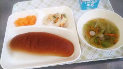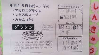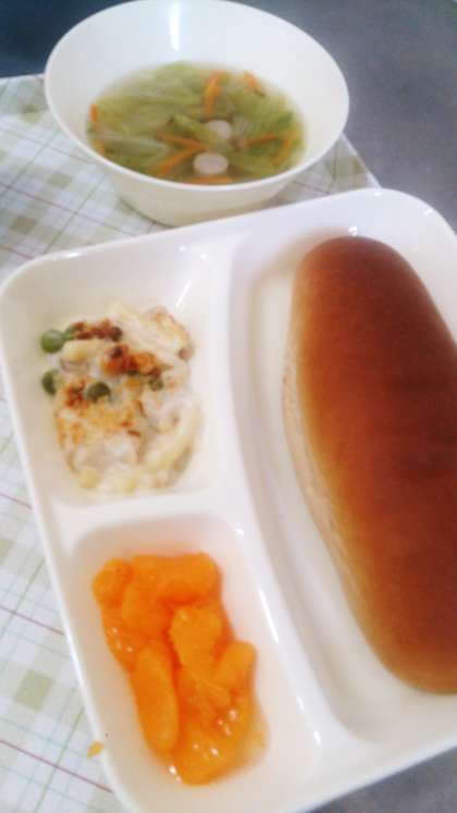 今日の給食は、マカロニグラタン、レタスのスープ、みかん、パン、牛乳です。