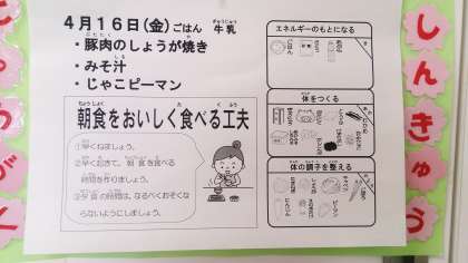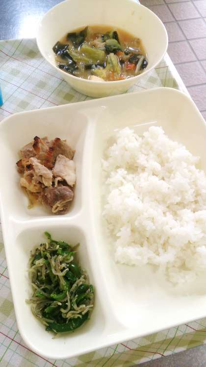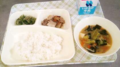 今日の給食は、豚肉のしょうが焼き、みそ汁、じゃこピーマン、ごはん、牛乳です。