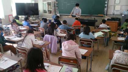 「友だち」だちという曲を聴いています。友だちへの思いがこもった曲です。指で拍子をとっています。