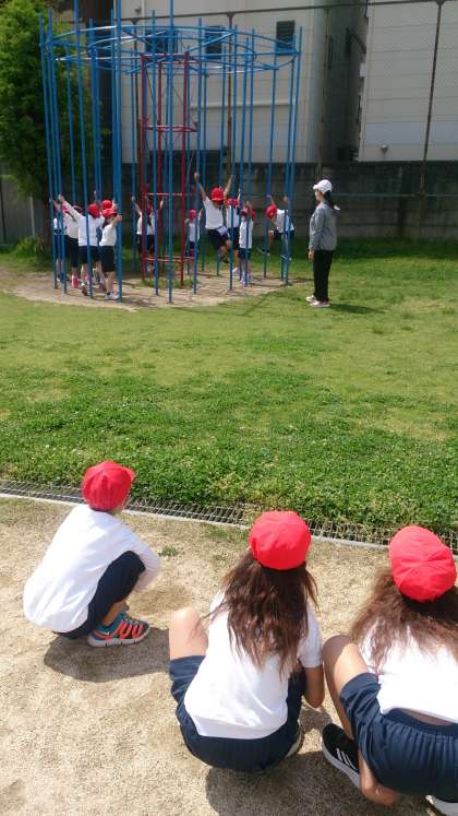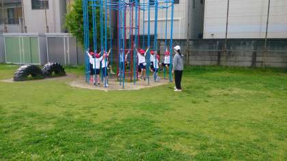 固定施設を使っての運動あそびをしました。写真は、のぼり棒で、支持やぶらさがり、手足の移動など多様な動きに取り組んでいる様子です。