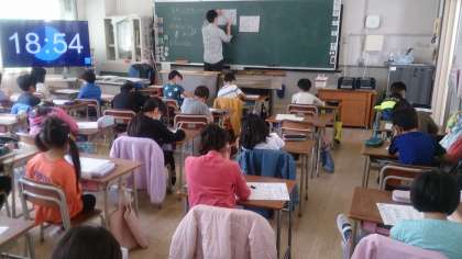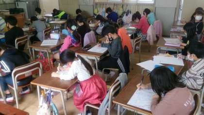 ペンを使って、長い線を描いています。みんな線が途切れないように工夫しながら描いていきます。